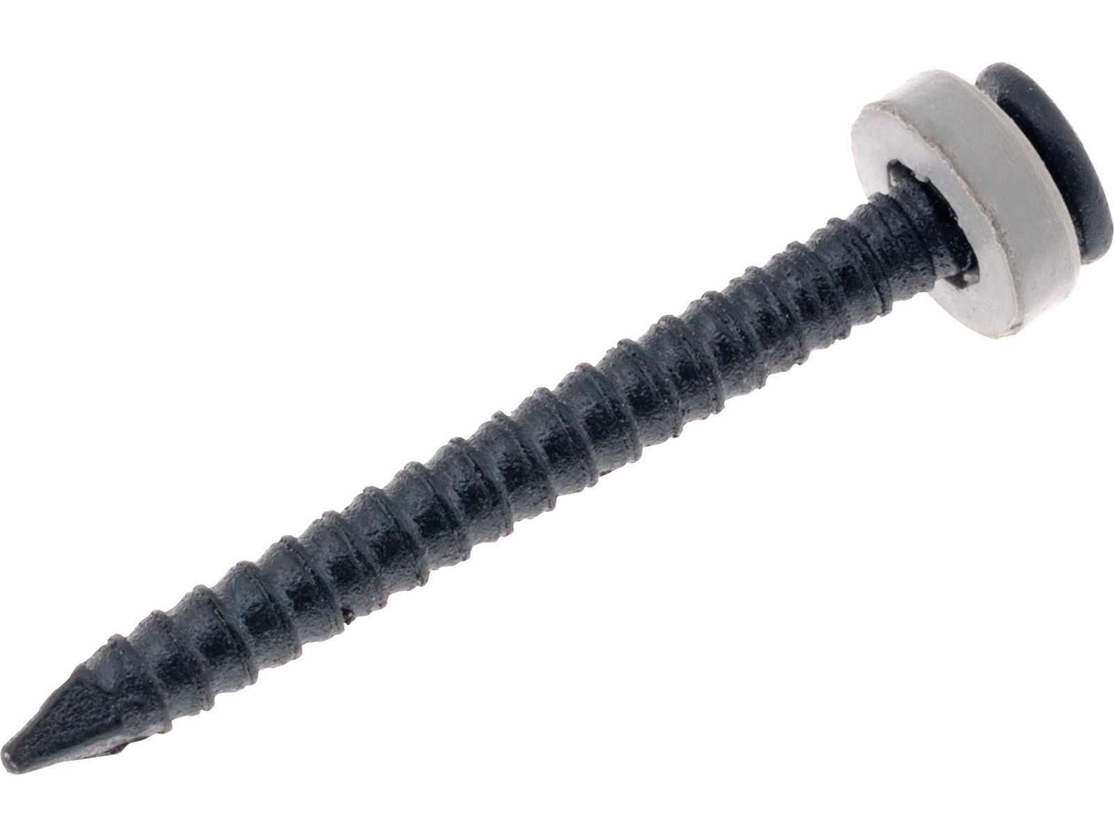 Spiker med avrundet hodet og tetningsskive, beregnet for montering av blikk på treverk. Produsert av herdet stål med hvitlakkert overflatebehandling.