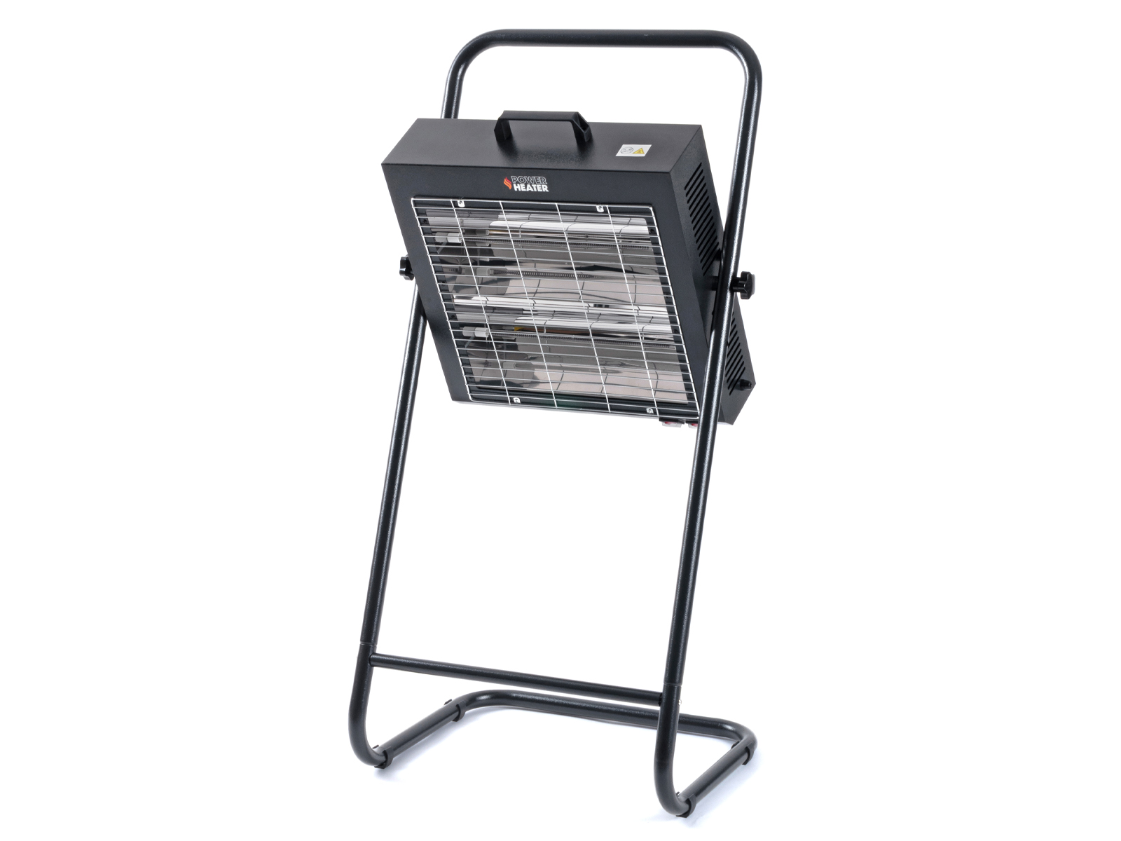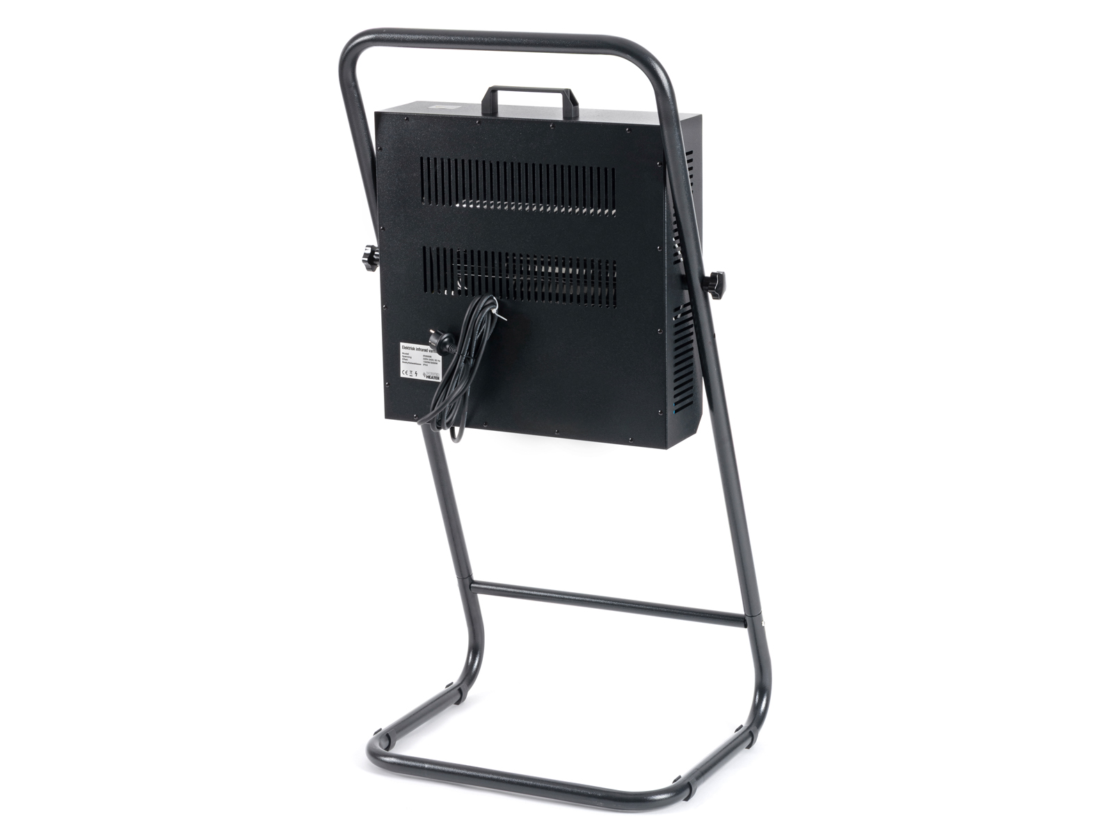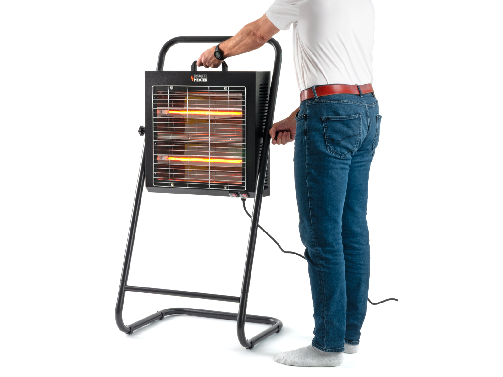 Varmeren er montert på et solid stativ. Selve varmeren er festet med 2 knottskruer som gjør det mulig å justere vinkelen på varmeren. Lav vekt og håndtak gjør den veldig enkel å flytte med seg.