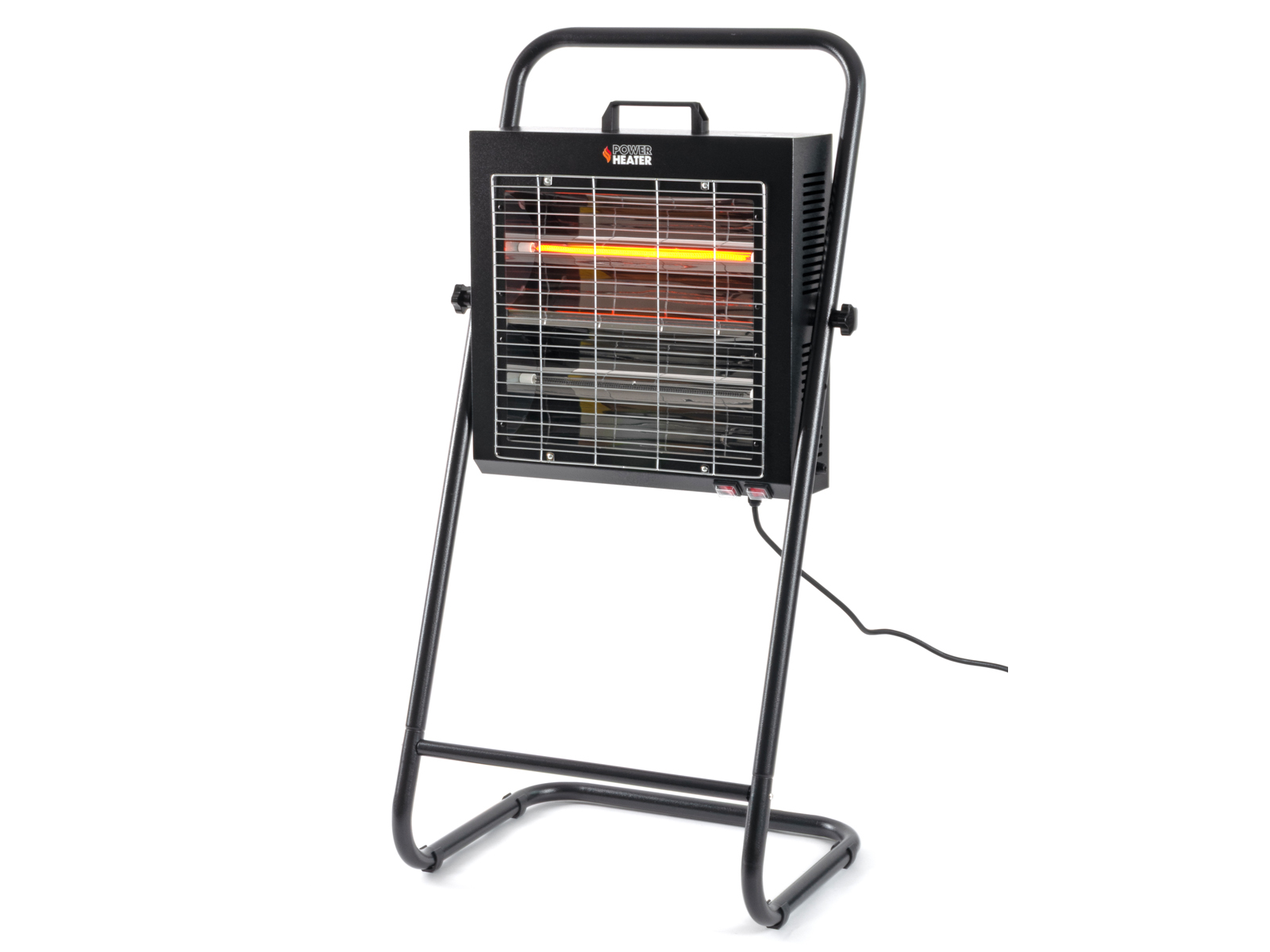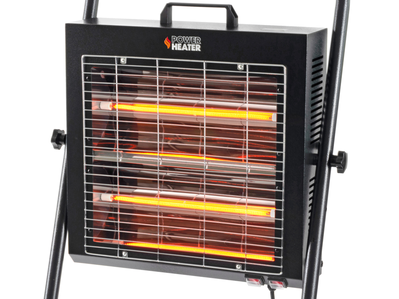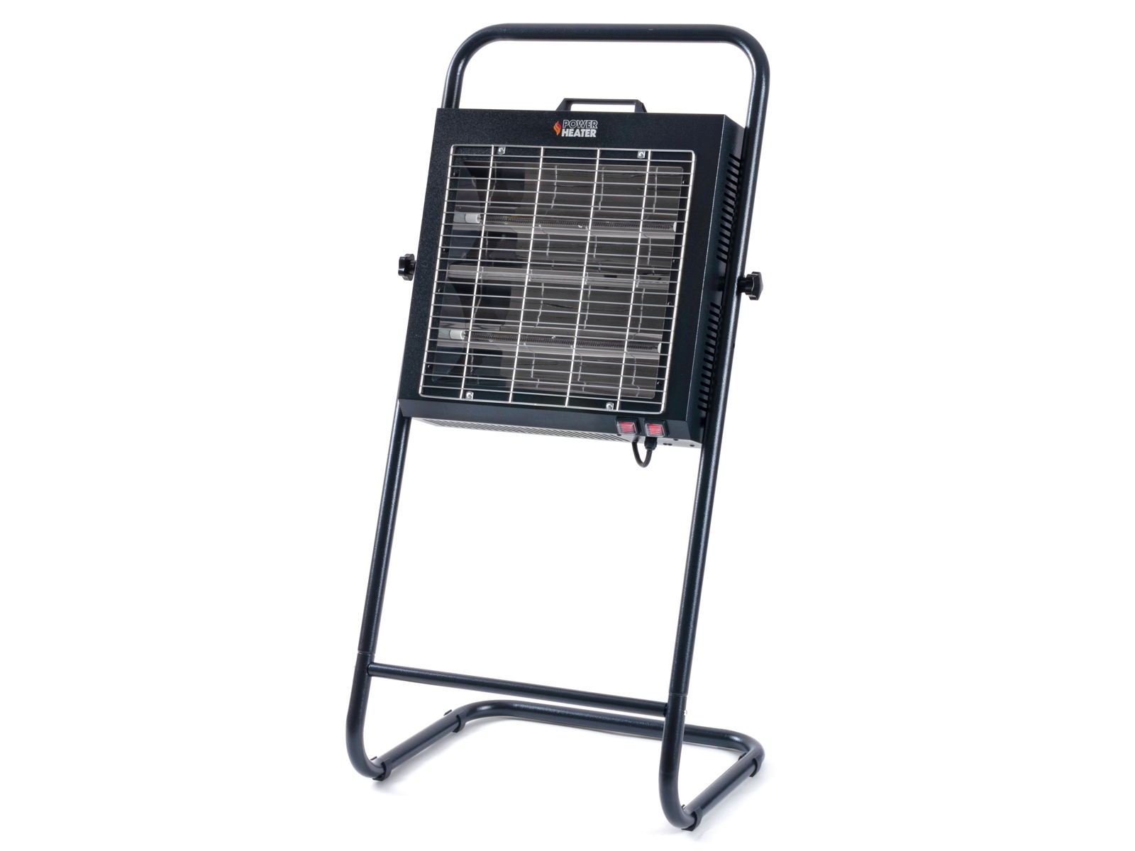 Varmeren er montert på et solid stativ. Selve varmeren er festet med 2 knottskruer som gjør det mulig å justere vinkelen på varmeren. Lav vekt og håndtak gjør den veldig enkel å flytte med seg.
