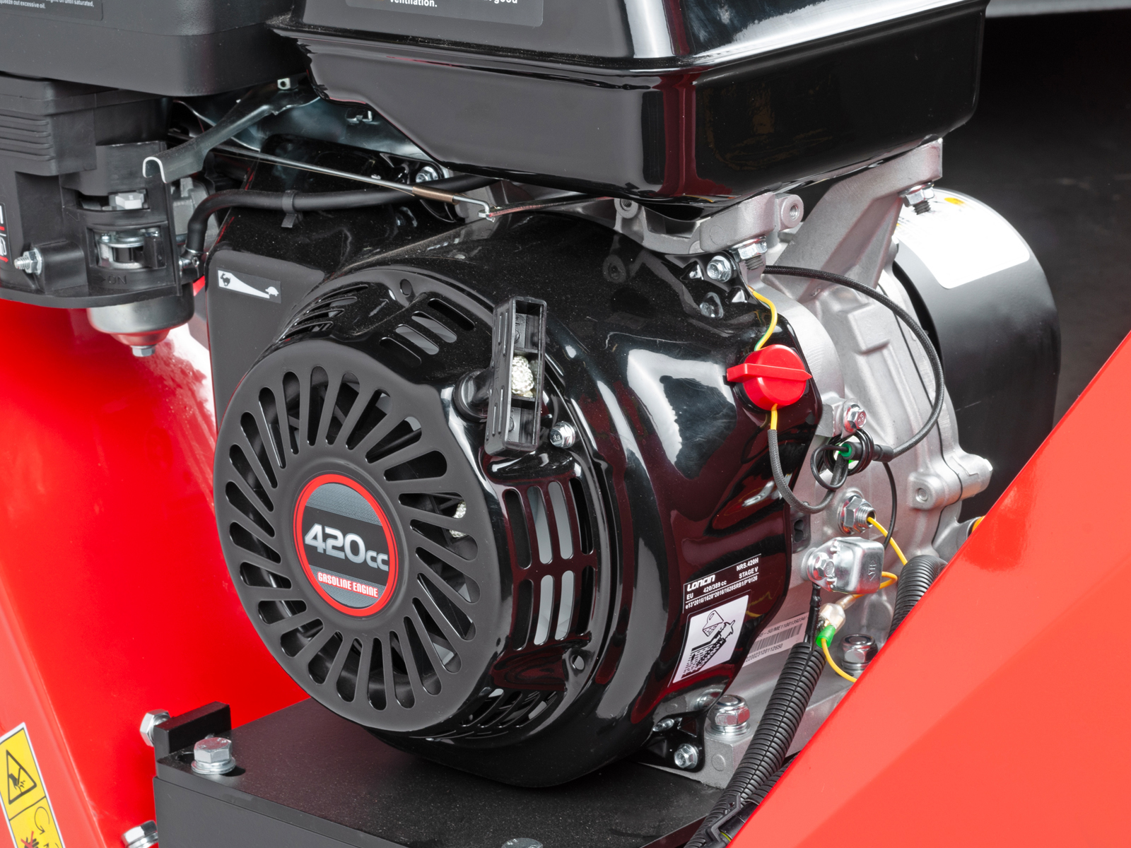 For brukerens sikkerhet er fliskutteren utstyr med nødstopp, samt gummideksel for innmating for å forhindre sprut av ved og bark.