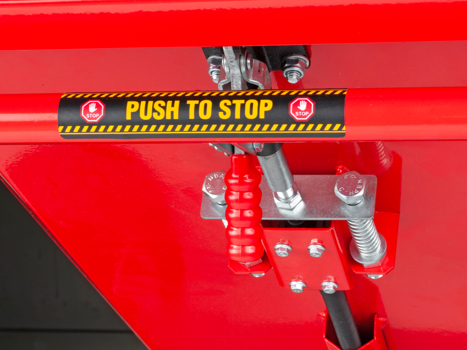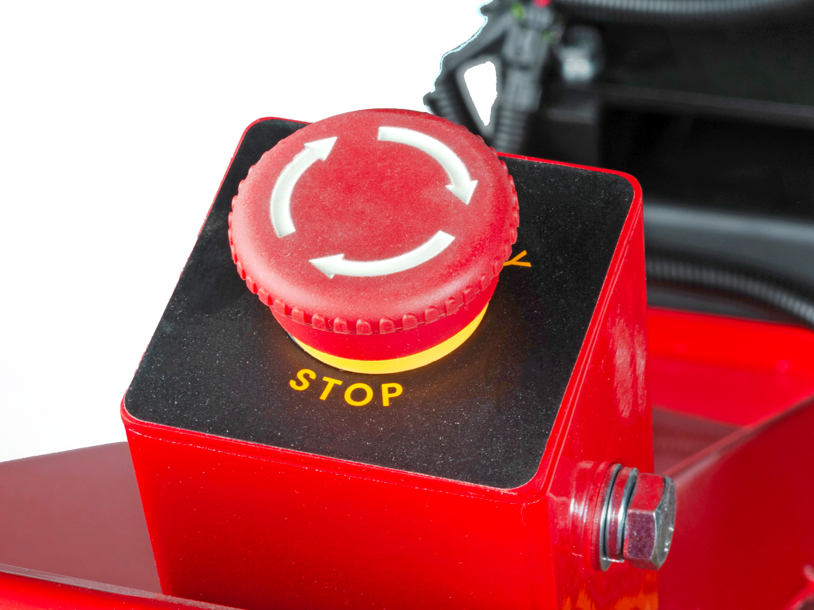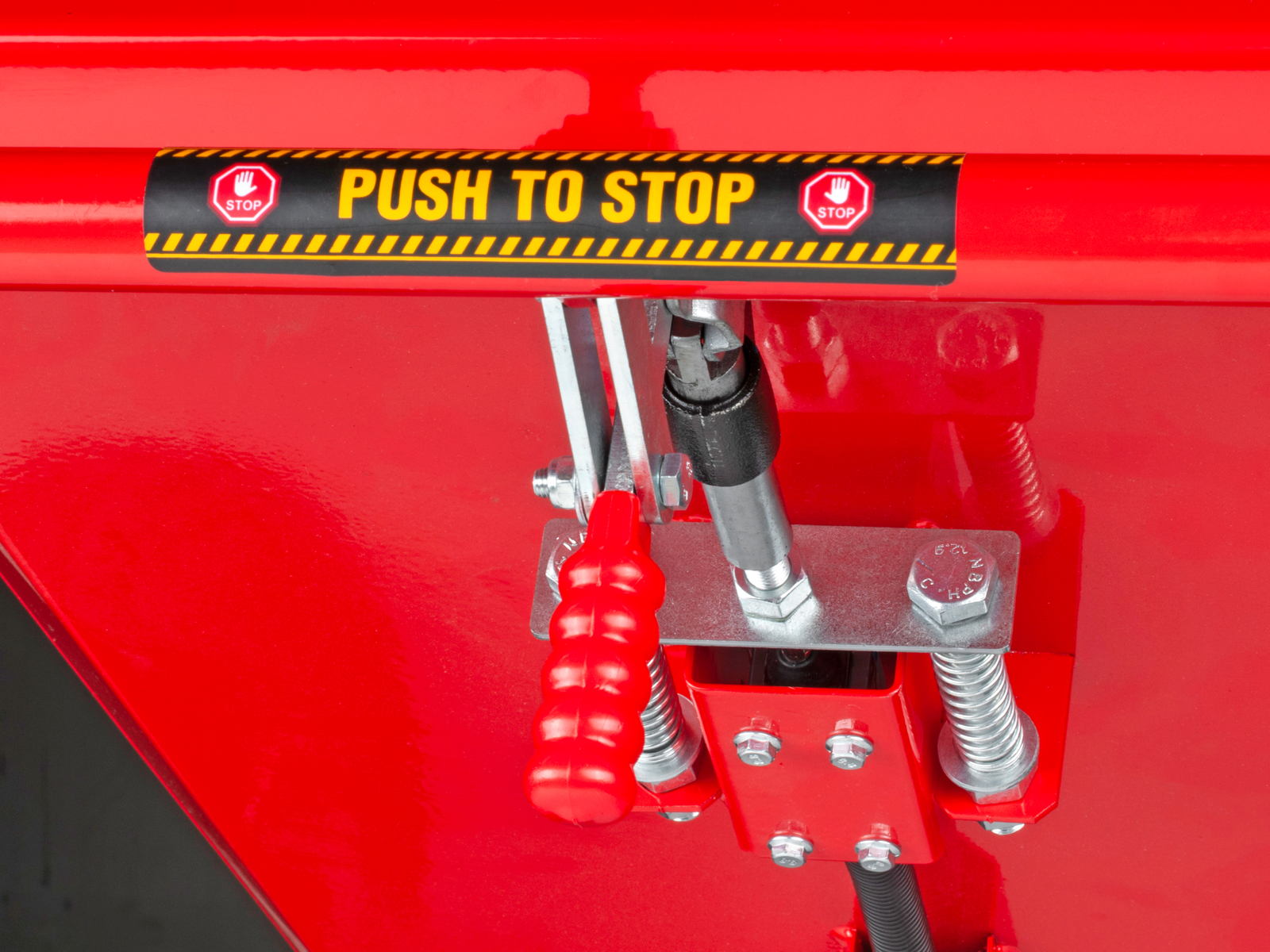For brukerens sikkerhet er fliskutteren utstyr med nødstopp, samt gummideksel for innmating for å forhindre sprut av ved og bark.
