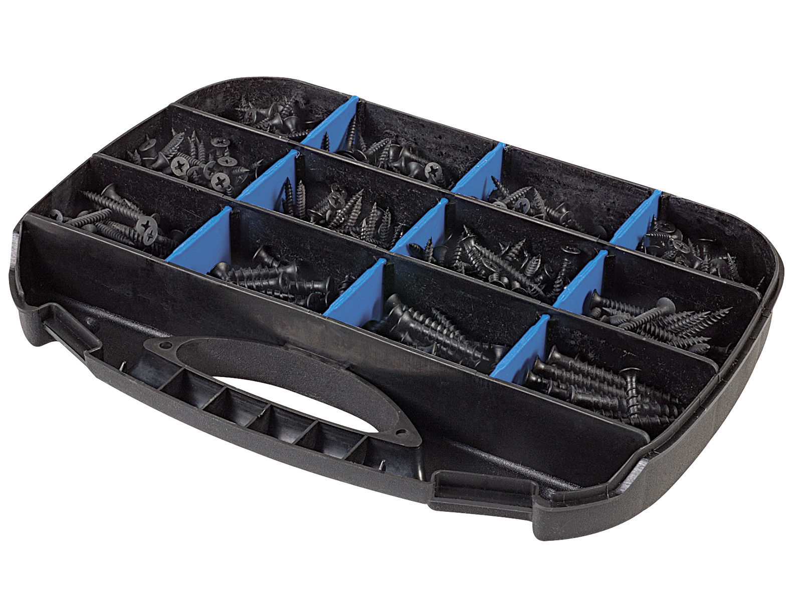 690 stk. En miks av gipsskruer elforsinket i størrelse 19-50 mm. Kommer i sortimentkoffert.