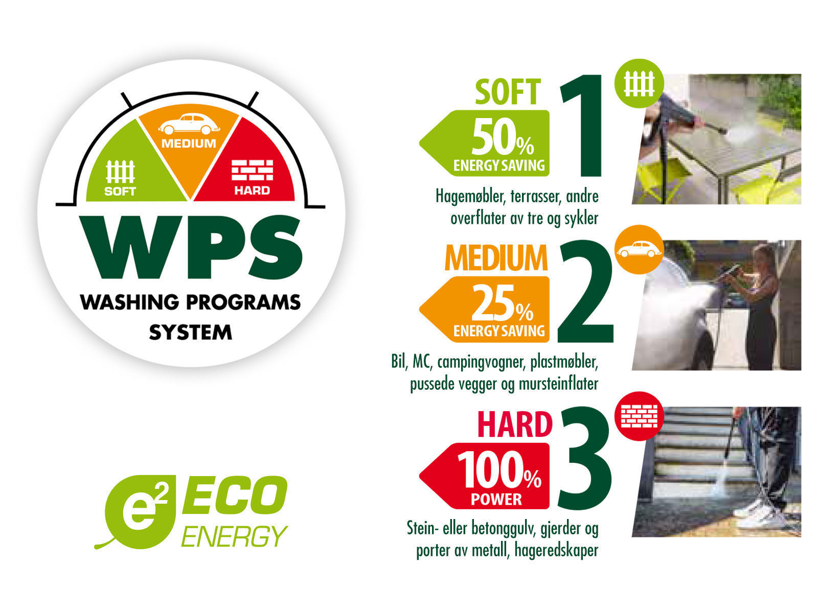 Meget kraftig og mobil høytrykksspyler med en ytelse på hele 160 bar og som gir en vannmengde på 8,0 l/min. Modellen har et patentert vaskeprogramsystem WPS (Washing Program System) og gir deg det mest egnede vaskeprogrammet for hver rengjøringsoppgave. Velg blant de tre vaske-programmene SOFT, MEDIUM og HARD. Da er du sikker på at trykk og vannmengde passer til vaskejobben du skal utføre: SOFT: Hagemøbler, terrasser og andre overflater av tre, sykler MEDIUM: Biler, motorsykler, campingvogner, plastmøbler, pussede vegger, mursteinsflater HARD: Stein- eller betonggulv, metallrekkverk, gjerder og porter, hageredskaper Vaskeprogrammene er optimalisert med tanke på trykk, levert vannmengde og driftsøkonomi. SOFT og MEDIUM sparer strøm og vil forlenge høytrykksspylerens levetid. HARD gir deg maks kraft når du trenger det! Nedfellbart teleskophåndtak og praktisk bærehåndtak i front gjør det enkelt å transportere høytrykksspyleren. Store hjul med gummibelegg sørger for at spyleren står stødig på alle underlag og gjør samtidig at den er enkel å flytte på. Pumpen i denne modellen har tre stempler, pumpehode av aluminium og har innebygd omløpsventil. Den har roterende av/på-bryter, samt automatisk start-/stopp-system som styres fra pistolgrepet. Høytrykkslangen kobles raskt og enkelt til pistol og høytrykksspyler med hurtigkoblinger. Lansen er utstyrt med hurtigkobling, noe som gjør bytte mellom det ulike tilbehørene raskt og enkelt. Slangespole for oppbevaring av høytrykksslangen når den ikke er i bruk. Utstyr og tilbehør som pistolgrep, lanse, dyser og såpebeholder har egne oppbevaringsplasser på vaskeren. Den er også utstyrt med en bred krok på baksiden hvor du kan henge ledningen ved lagring. høytrykksspyleren leveres med høytrykksslange på 6 meter, pistolgrep med låseknapp, terrassevasker med forlenger, justerbar såpebeholder som festes til lansen, høytrykksdyse med Variojet, dyse med justerbar viftestråle, turbodyse og vannfilter for vanninntak.