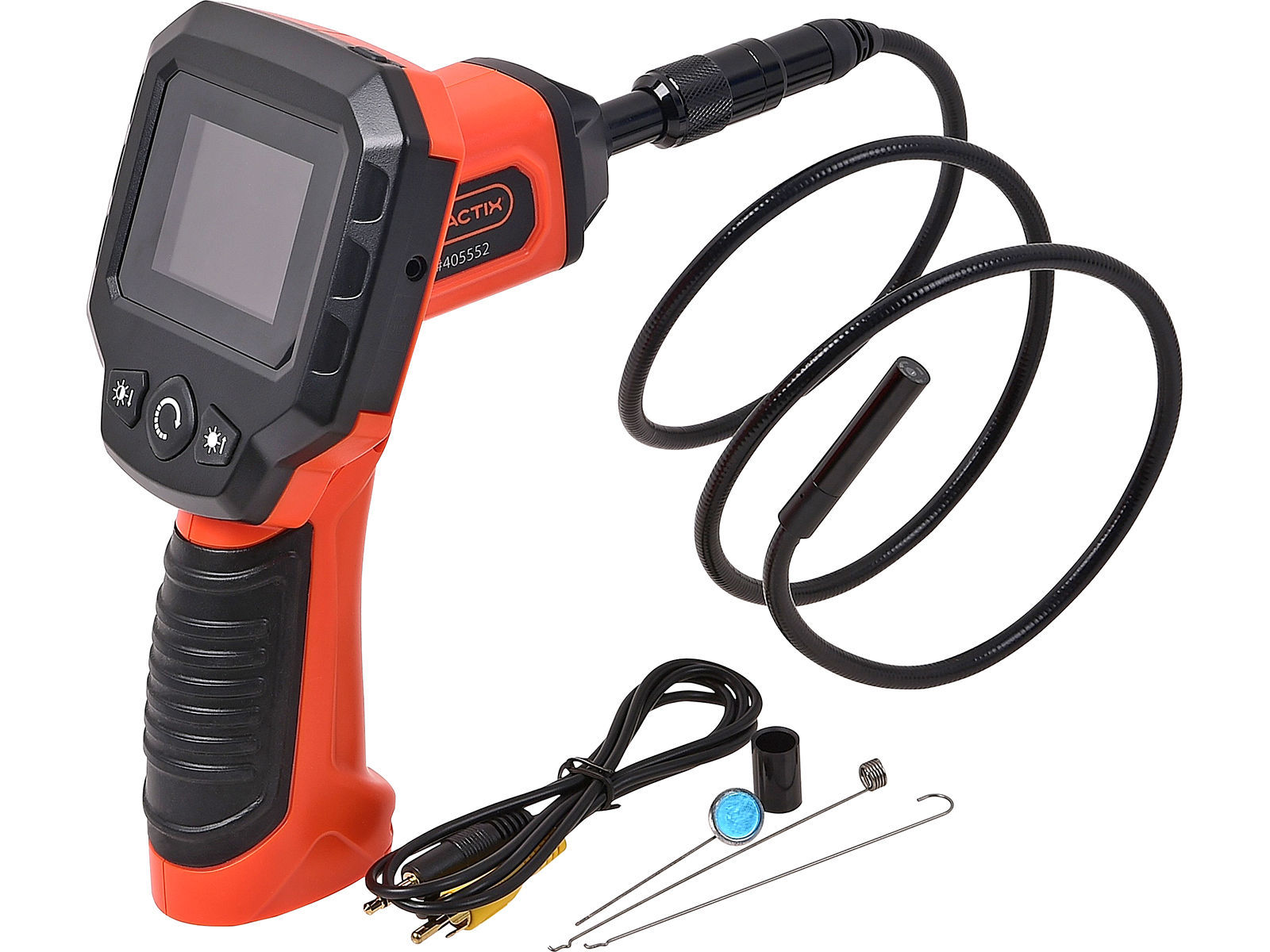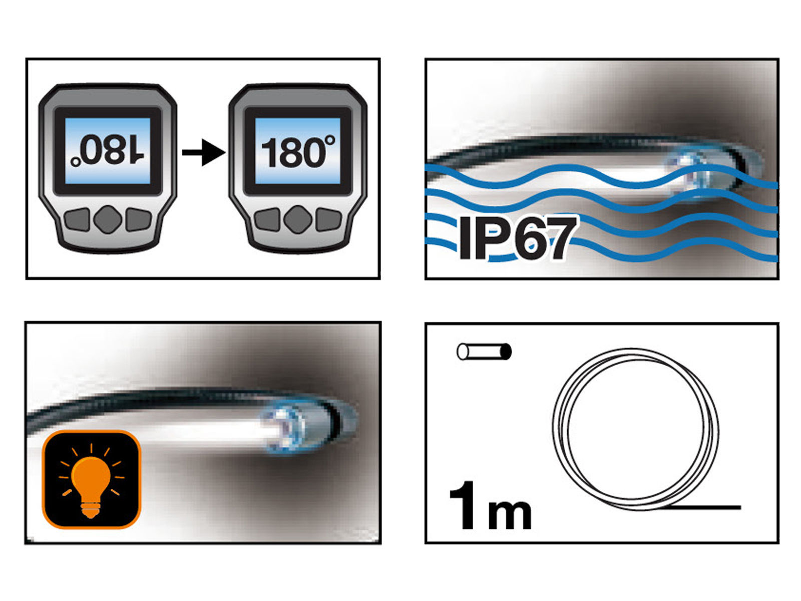 Kameraet sitter på enden av en fleksibel og bøyelig kabel som gjør det enkelt å komme til på trange og utilgjengelige plasser. Kabelen er 1 meter lang og kamerasonden har beskyttelsesklasse IP67, noe som gjør at den kan brukes i områder fylt med væsker. LCD-fargeskjerm med mål 6x6 cm og oppløsning på 640x480 piksler. Bildet på skjermen kan roteres i 90° i 4 posisjoner.