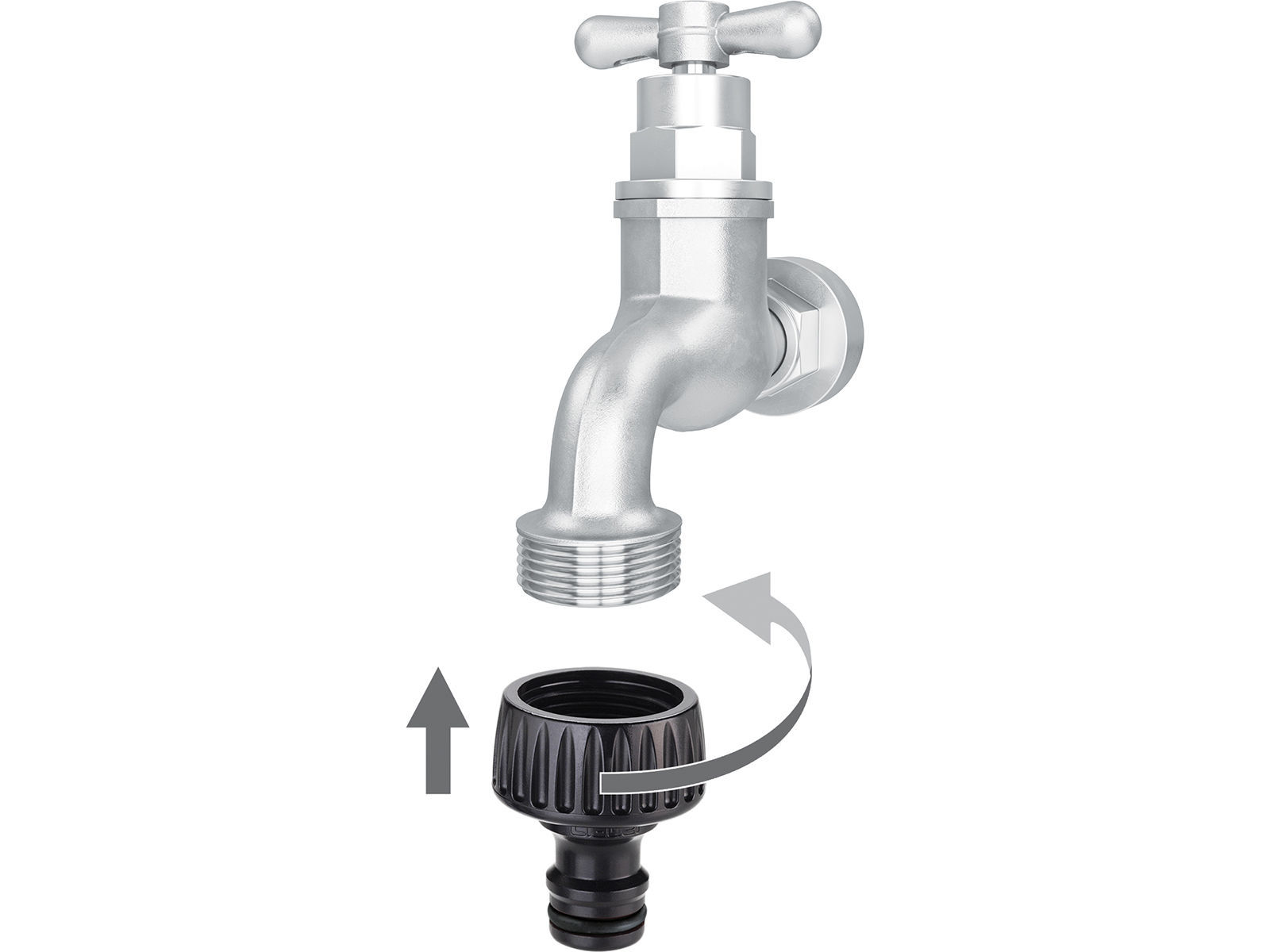 Krankobling for enkel og rask tilkobling til en vannkran med 3/4" utvendig gjenger - uten bruk av verktøy. Med pakning som sikrer en stabil, lekkasjefri tilkobling. Den ergonomiske utformingen gjør det enkelt og praktisk å bruke selv med våte fingre.