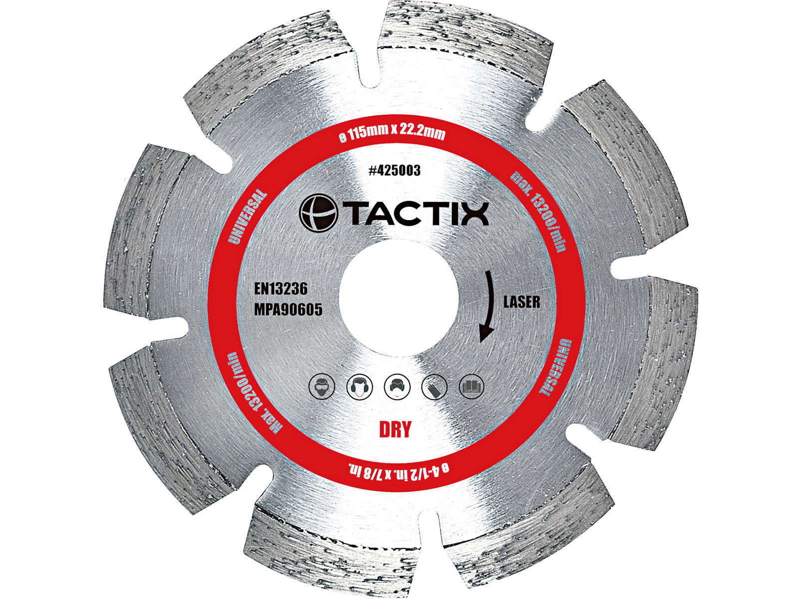 Lasersveiset kutteskive i industrikvalitet for lang levetid. Tørr kapping. Bruksområde: Betong, armert betong mur, granitt, naturstein og byggestein.