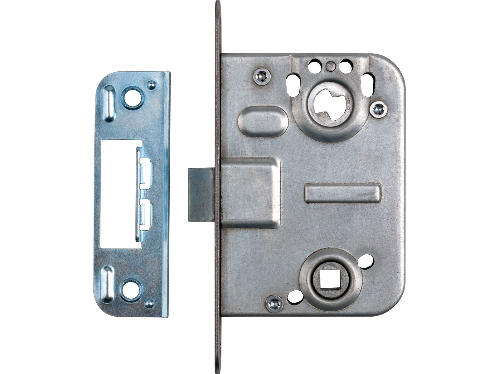 Låskasse for innvendig lettdører som betjener vriderreilen med sylinder eller vriderknapp. Elforsinket utførelse. Slagretning endres ved å trekke ut vriderfallen og vri den 180 grader. Leveres med sluttstykke. Sylinder 55537 benyttes på denne låskassen.