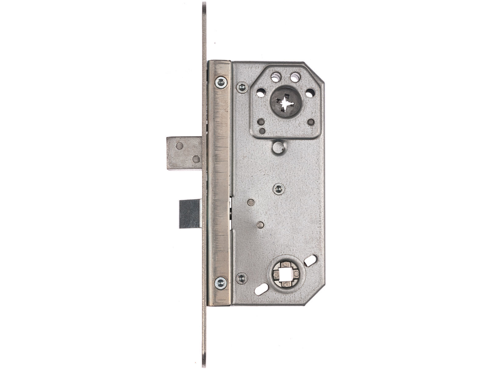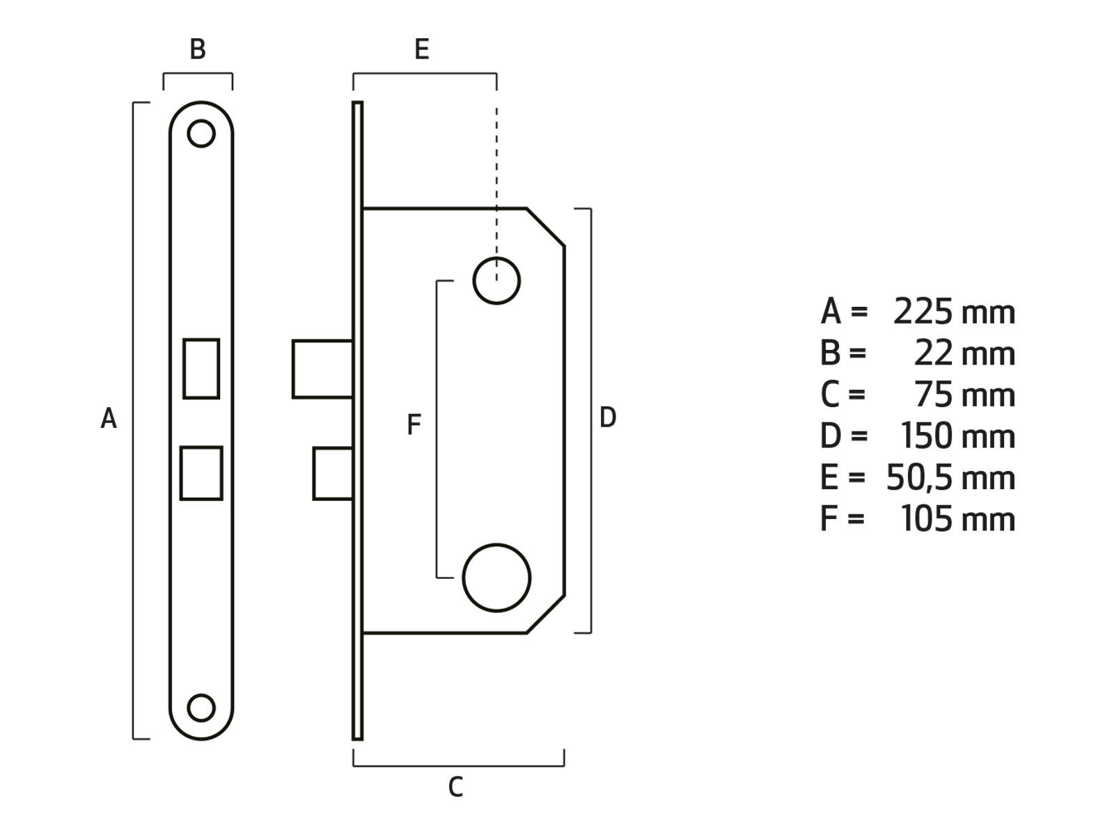 Låskasse for ut og innvendige dører som betjener låsreilen med sylinder eller vriderknapp. Elforsinket utførelse. For endring av slagretning må frontstolpe demonteres. Vend vriderfalle 180 grader og monter tilbake frontstolpe. Låses ved 360 graders vridning av nøkkel/vriderknapp. Låskassen tilsvarer låskasse 8765. Mål: Stolpe 22x225 mm, Dybde 76 mm, Dorn/Backset 50 mm. Låskassen kan kun benyttes sammen med sluttstykke 75950, varenr 720154.