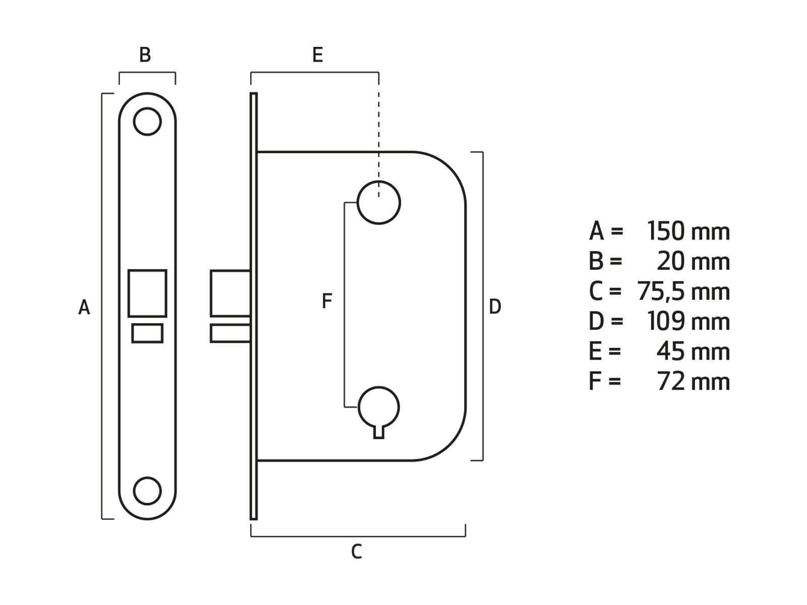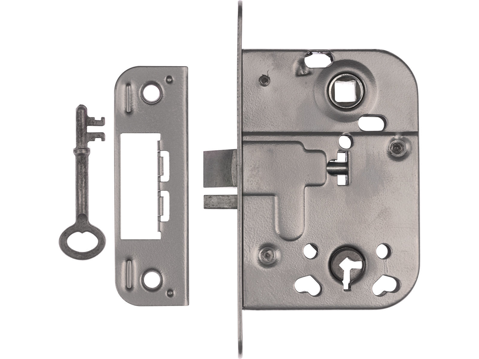 Låskasse for innvendige lettdører som betjener låsreilen med nøkkel. Elforsinket utførelse. Slagretning endres ved å trekke ut vriderfallen og vri den 180 grader. Leveres med nøkkel nr 5 og sluttstykke. WC-garnityr kan også benyttes på denne låskassen.