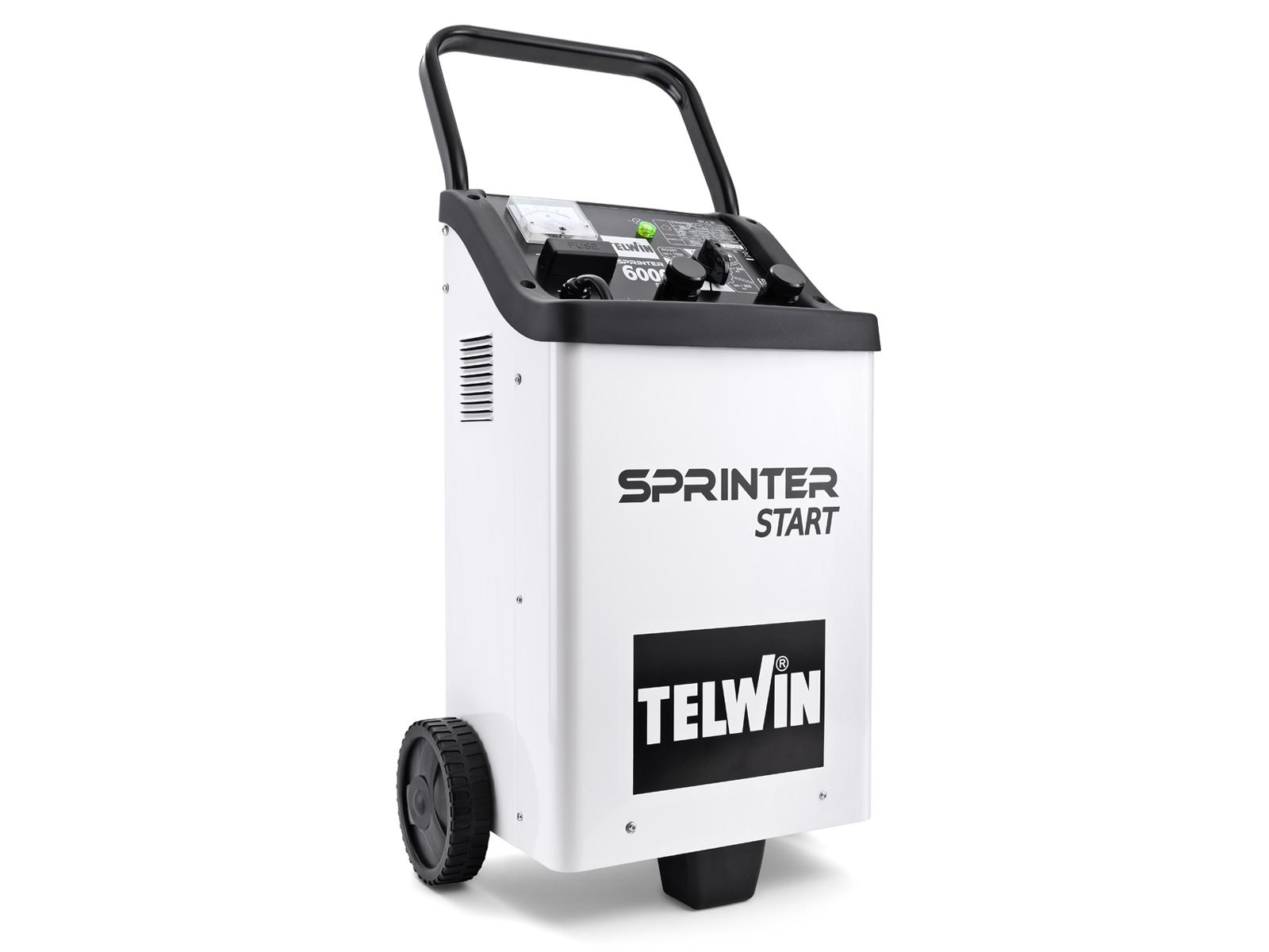 Leveres komplett med håndtak, amperemeter, sikringer, skrukobling for enkelt skifte mellom 12 og 24 V. batteri, samt kabler/klemmer. Eget rom for plassering av kabler/klemmer når disse ikke er i bruk.
