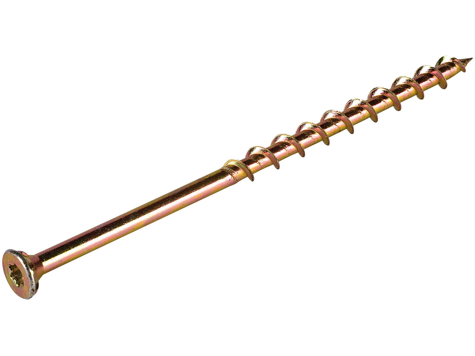 Skrue med grove gjenger beregnet for montering av tre på leca , uten forboring. Produsert av herdet stål med gulkrom overflatebehandling. Rillespor under hodet sørger for at skruen forsenkes godt i underlaget. Skruen har Torx spor.