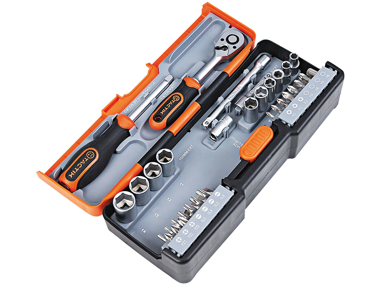 Pipenøkkelsett 43 deler i Crv-stål kvalitet. Inneholder Bits 25mm: PH0, 2xPH1, 2xPH2, 2xPH3, Fl3, Fl4, Fl5, Fl6, PZ1, PZ2, PZ3, H3, H4, H5, H6, S0, S1, S2, TX8, TX10, TX15, TX20, TX25, TX27, TX30. Piper: 12 stk 1/4" piper 5,5-14 mm, 1/4" vrihåndtak, 2 stk 1/4" forlengere 50 og 100 mm og bits-/pipenøkkeladapter.
