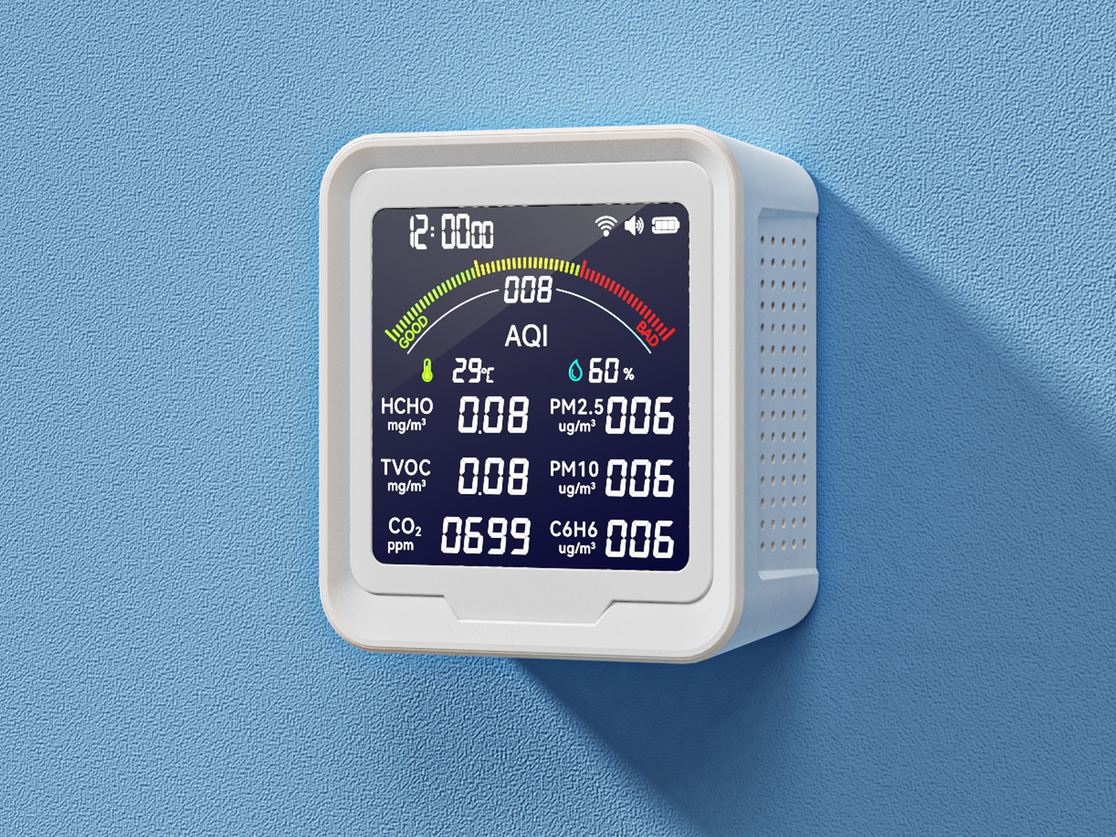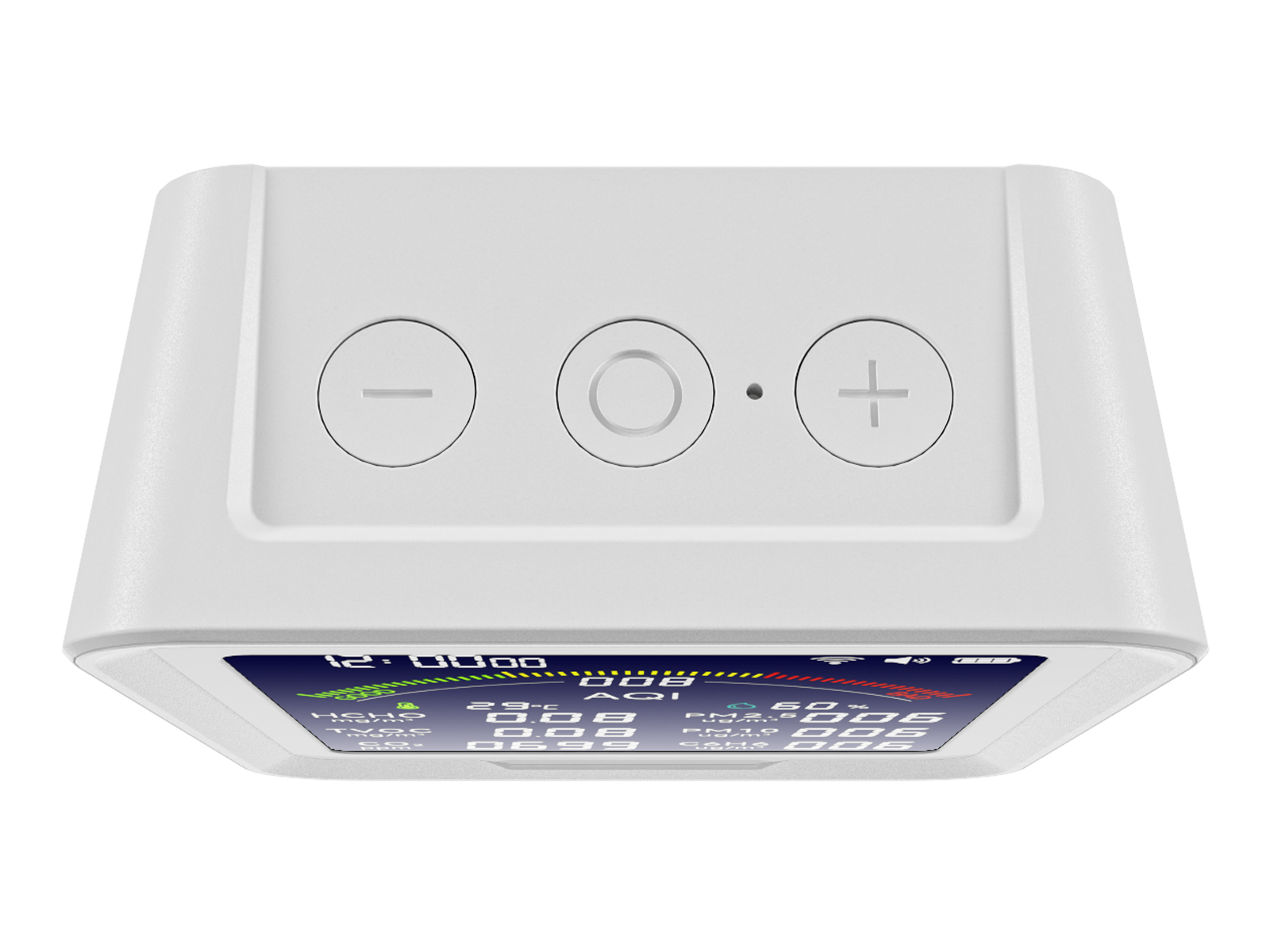 - Presis måling av luftkvalitet– registrerer CO₂, temperatur, fuktighet, TVOC, formaldehyd, PM2.5, PM10, m.m.