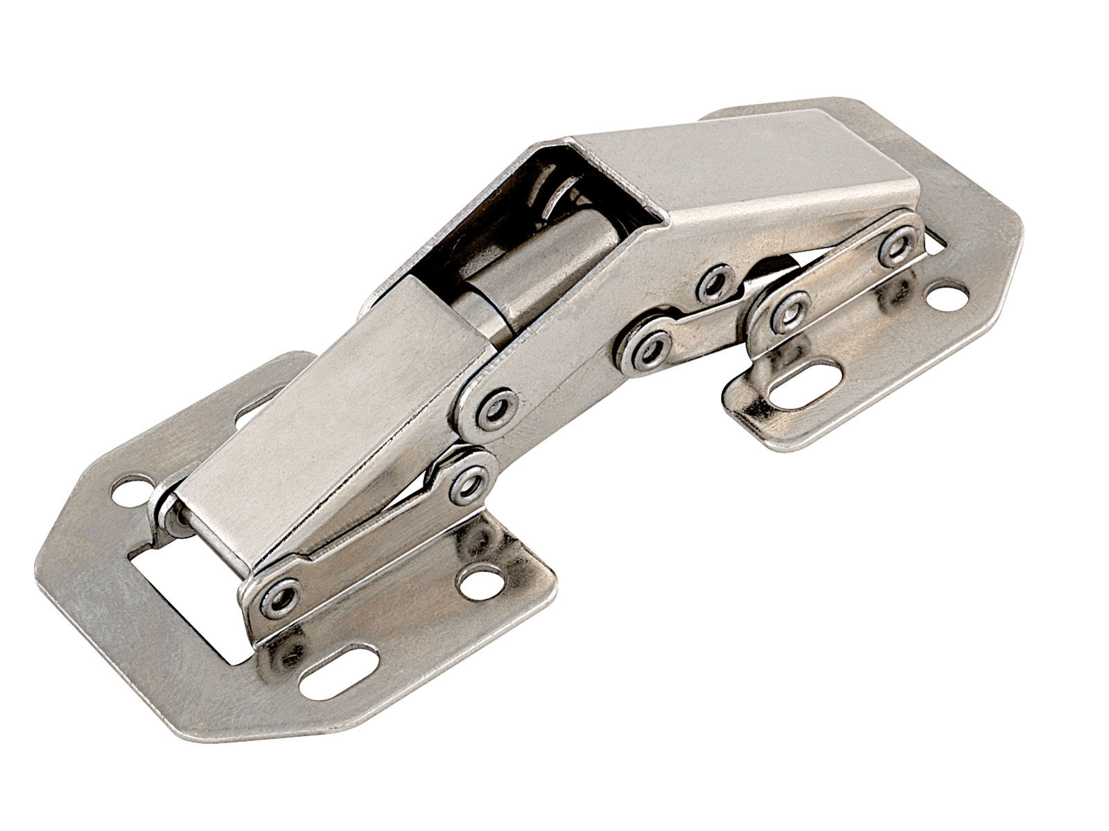 For montering på skapdører uten fresehull. Åpner 90°. Maks. belastning pr. hengsel er ca. 10 kg.
