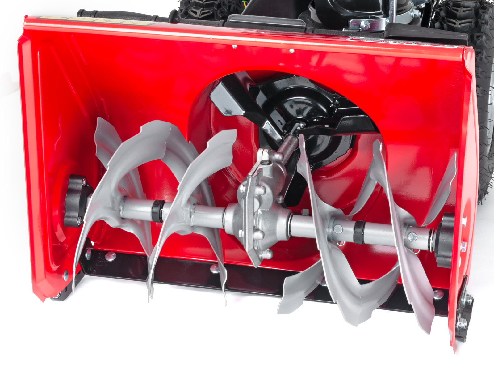 Alle våre bensindrevne snøfresere er utstyrt med to-trinns funksjon for fresing av snø. I trinn en bearbeider skovlene snøen og skyver snøen inn i innmatingshuset. I trinn to kastes snøen ut gjennom utkasteren ved hjelp av et roterende utkasterhjul. Denne modellen startes med snorstart, motoren er lettstartet.