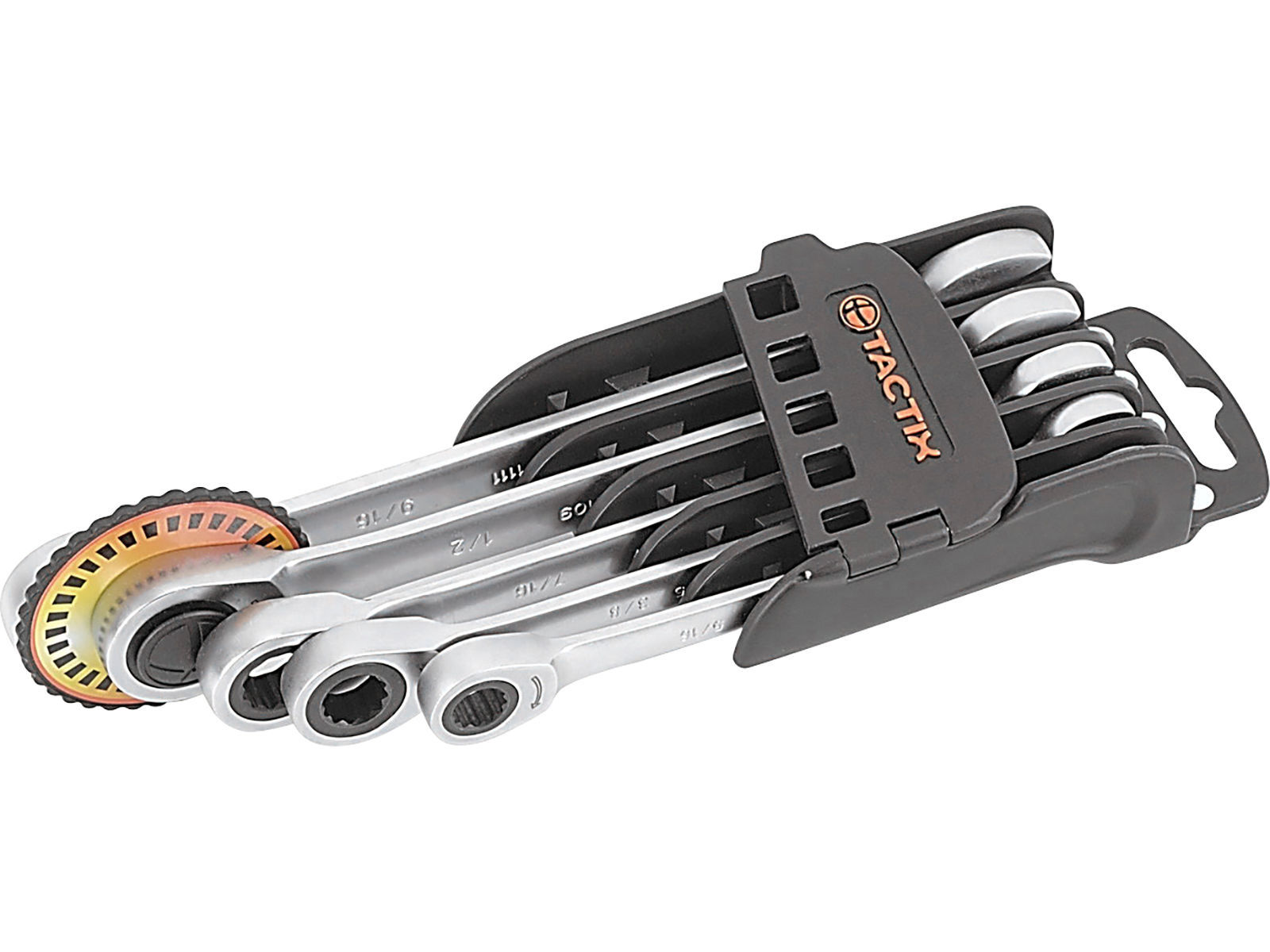 Krom vanadium utførelse. Leveres i praktisk foldbar holder med belteklips. Settet inneholder nøkler i følgende dimensjoner: 5/16, 3/8, 7/16, 1/2 og 9/16 tommer.  72 tenner.