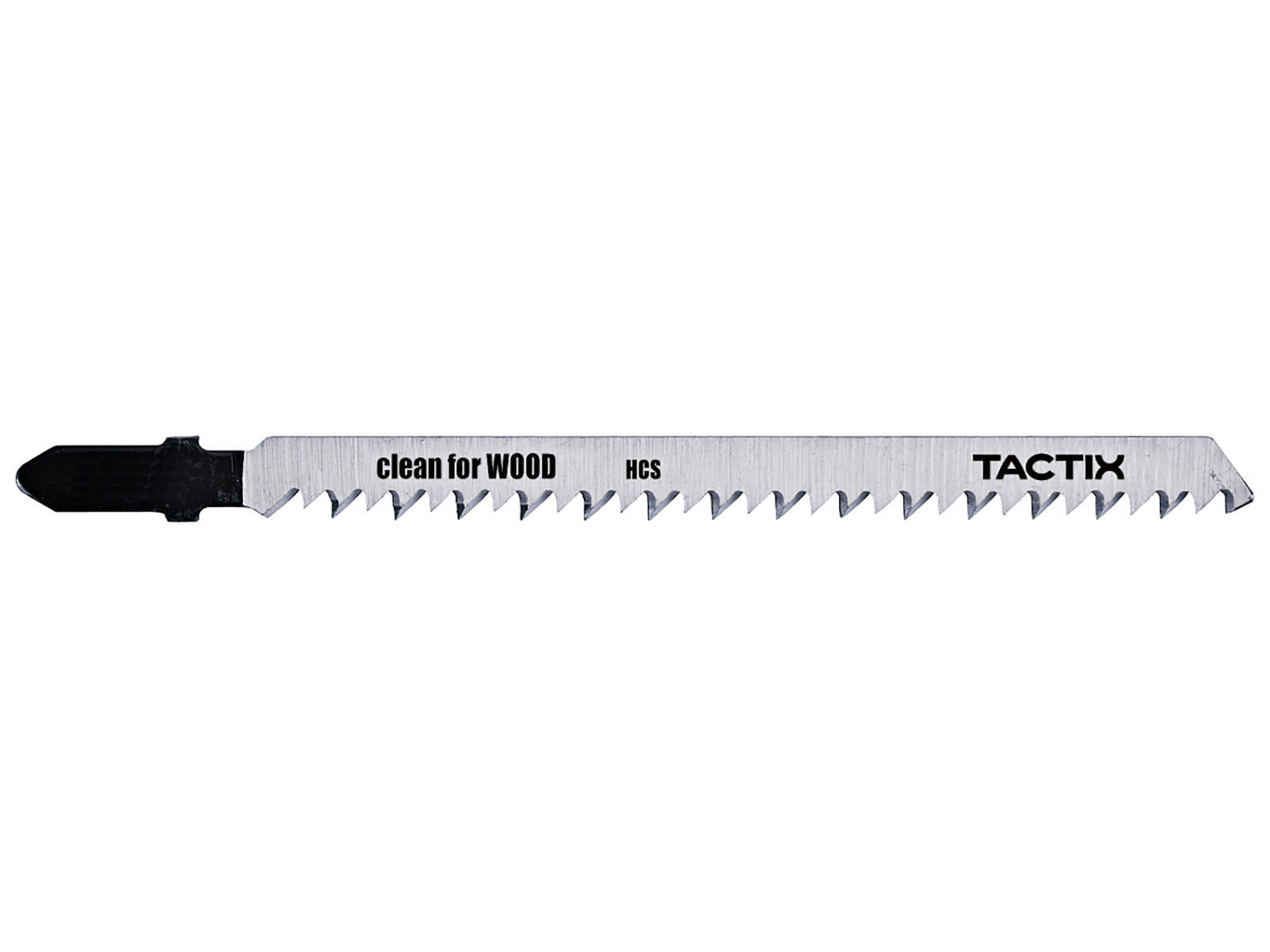 Clean for Wood stikksagblad lager rene rette kutt i tre. Blad av høykarbonstål som er egnet for å kutte mykt treverk og ikke-slipende trearbeidsmaterialer. Det har middels tannavstand (3,2 mm) og lang lengde (116 mm) og kutter trematerialer med en tykkelse på 10-65 mm. T-feste.