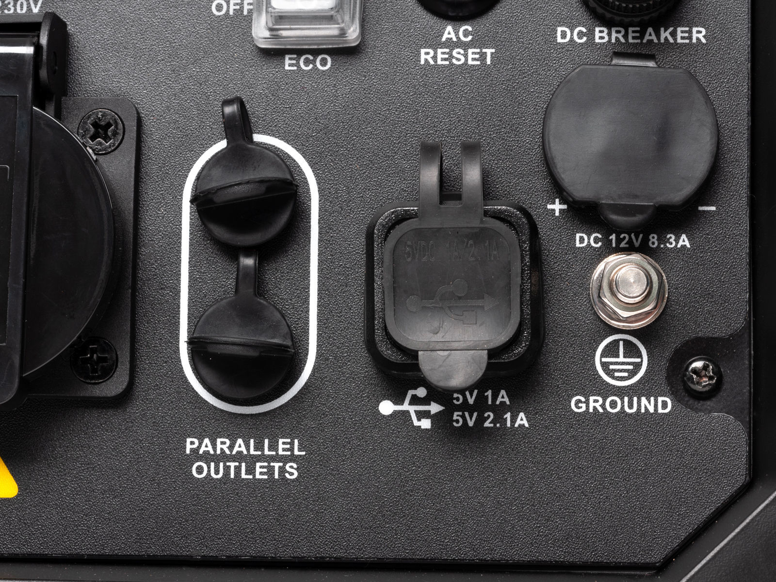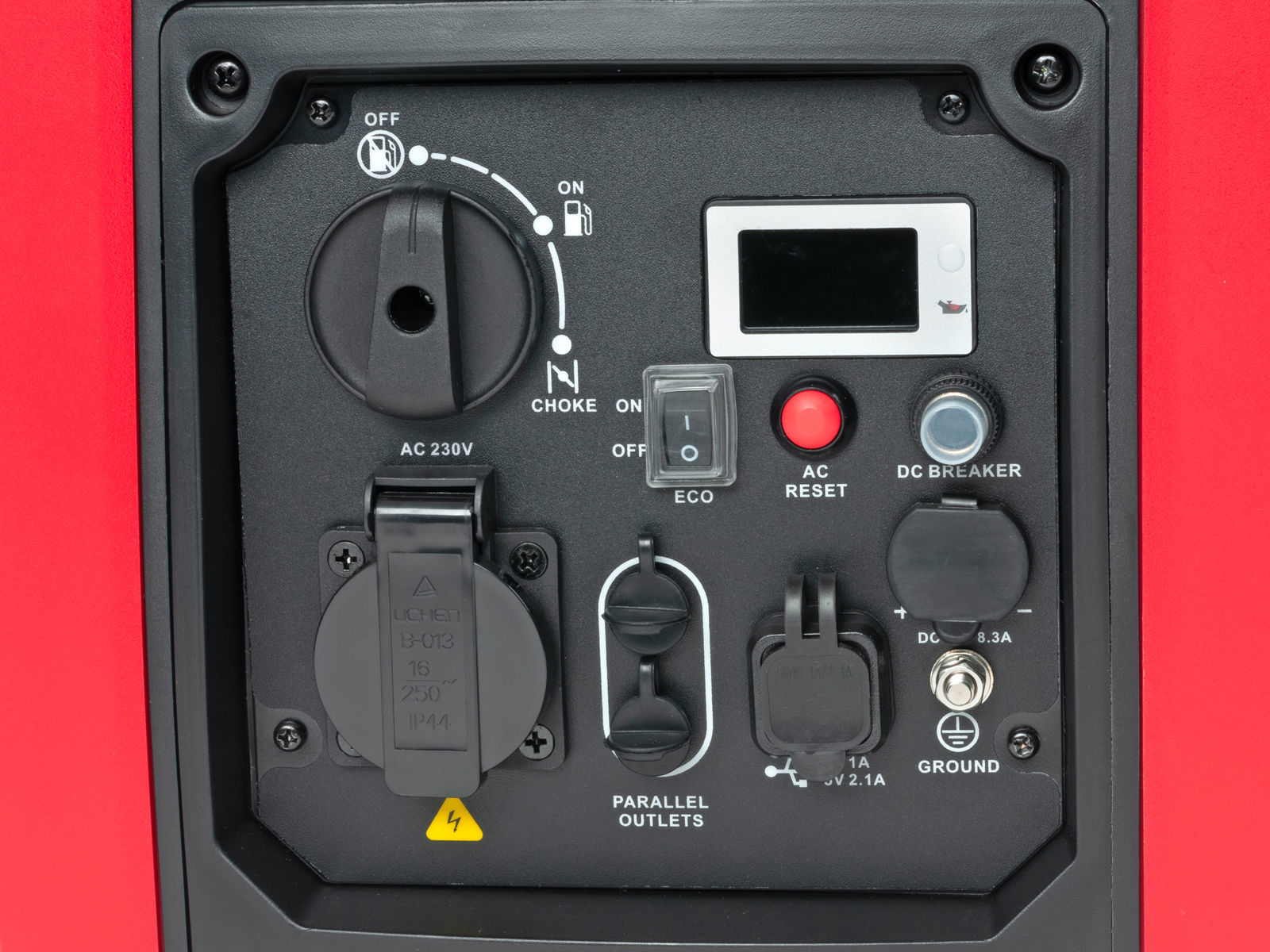 Maks ytelse på hele 1,9 kW – lav vekt 22 kg. Stillegående og lettstartet bensinmotor med lavt bensinforbruk Renere, mer stillegående og pålitelig strømforsyning Ny generasjon inverter strømaggregat med en rekke nye fordeler. Lettstartet bensinmotor med automatisk choke, som tilfredsstiller Euro 5-standarden, med høy virkningsgrad, slik at du kan belaste aggregatet mer i startøyeblikket. Lavt bensinforbruk mot mange sammenlignbare modeller gir lavere kostnad og spart energi. Den nye bensintypen 95 oktan E10 kan trygt benyttes på denne modellen. Motoren er også utstyrt med Eco-bryter, som automatisk justerer turtallet i forhold til belastning, noe som fører til mindre drivstofforbruk og støy, samtidig som motorens levetid forlenges. Renere, mer stillegående og pålitelig strømforsyning, en ren sinuskurve gir en jevnere strøm av meget høy kvalitet, faktisk bedre enn vanlig strømnett. Dette gjør at finelektronikk slik som PC, data, elektronikk, elektroverktøy mv. trygt kan benyttes. Flere muligheter for strømuttak; ett 230V uttak, ett 12V uttak og to USB-A uttak. Aggregatet er klargjort for parallellkobling med samme type aggregat for dobbel effekt. Aggregatet leveres med storstart. Forgasseren reagerer raskt på drivstofftilførsel, enklere å starte, også etter en tids lagring. Lavere støy da ny konstruksjon med lette bevegelige deler reduserer vibrasjoner. Nyutviklet eksossystem og lavere vibrasjoner reduserer støy med 1-2 dBA sammenlignet med tilsvarende produkter. Aggregatet leveres videre med en rekke sikkerhetsfunksjoner; AVR (automatisk spenningsregulering), digitalt display som viser spenning og frekvens, oljevakt og en 4-takts bensinmotor med automatisk trinnløs hastighetskontroll tilpasset belastning, noe som gir ca 20% lavere drivstofforbruk.