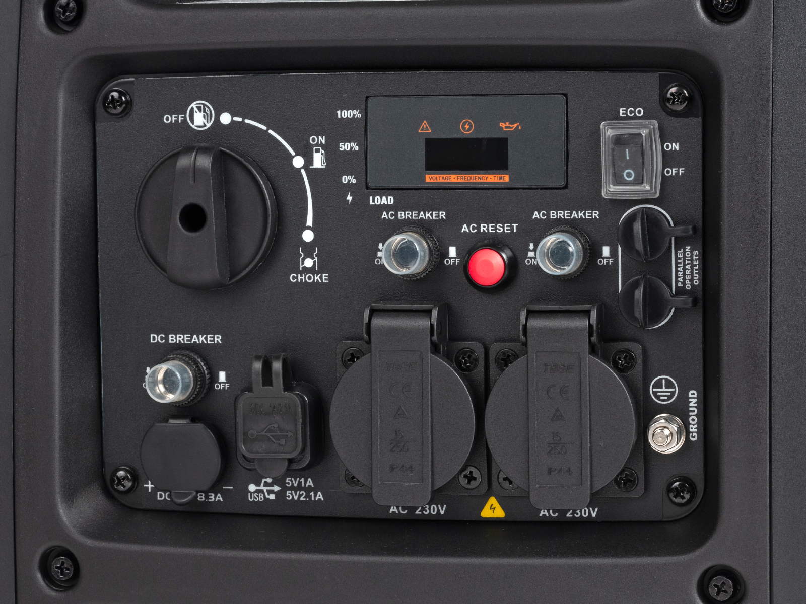 Aggregatet leveres videre med en rekke sikkerhetsfunksjoner; AVR (automatisk spenningsregulering), digitalt display som viser spenning og frekvens, oljevakt og en 4-takts bensinmotor med automatisk trinnløs hastighetskontroll tilpasset belastning, noe som gir ca 20% lavere drivstofforbruk.