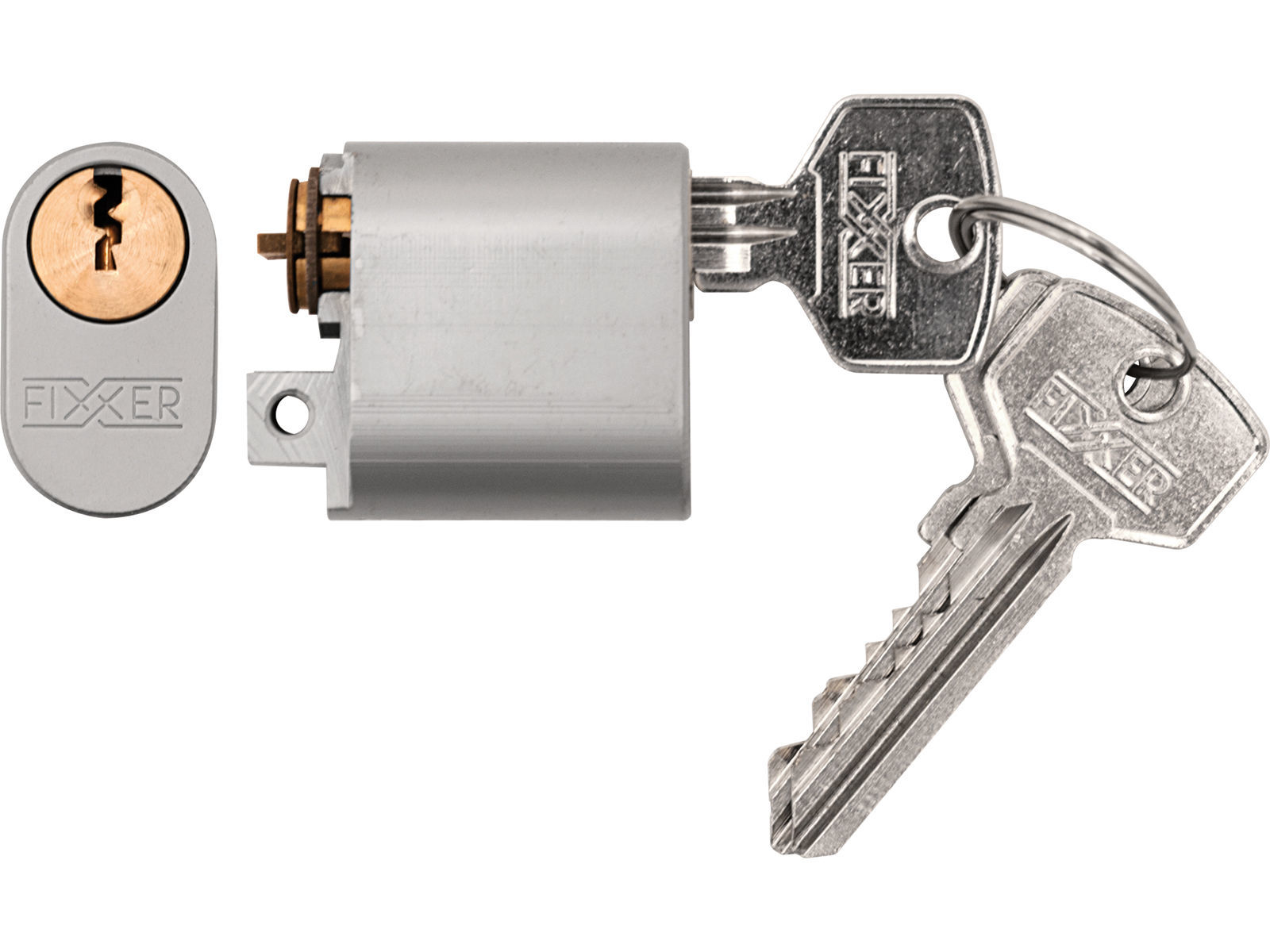Sylinder for ut og innvendige dører med 6 stifter. Krom matt utførelse. Leveres med 3 nøkler. Passer i kombinasjon med låskassene 72016, 552 og 5116.