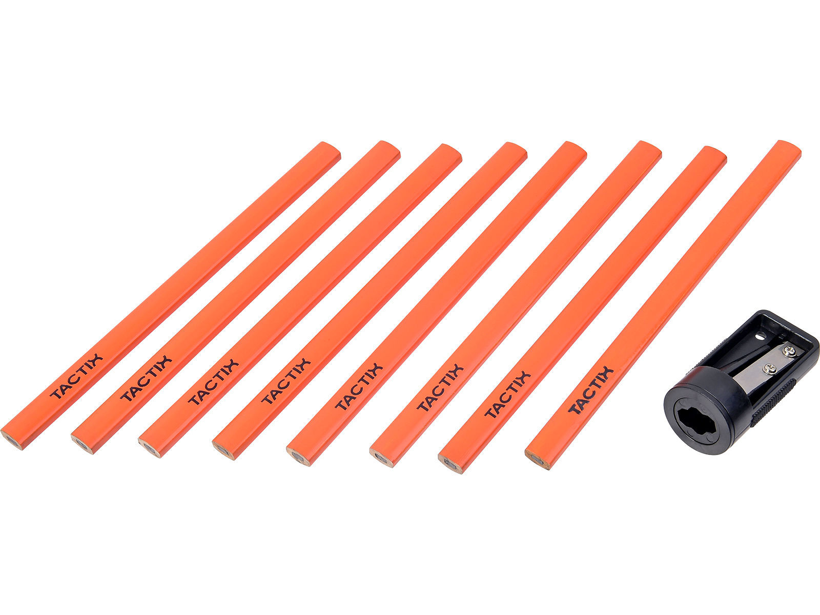 Snekkerblyanter med lengde 175 mm. Firkantet utforming med avrundede kanter for å forhindre rulling. Blyantspiser følger med.