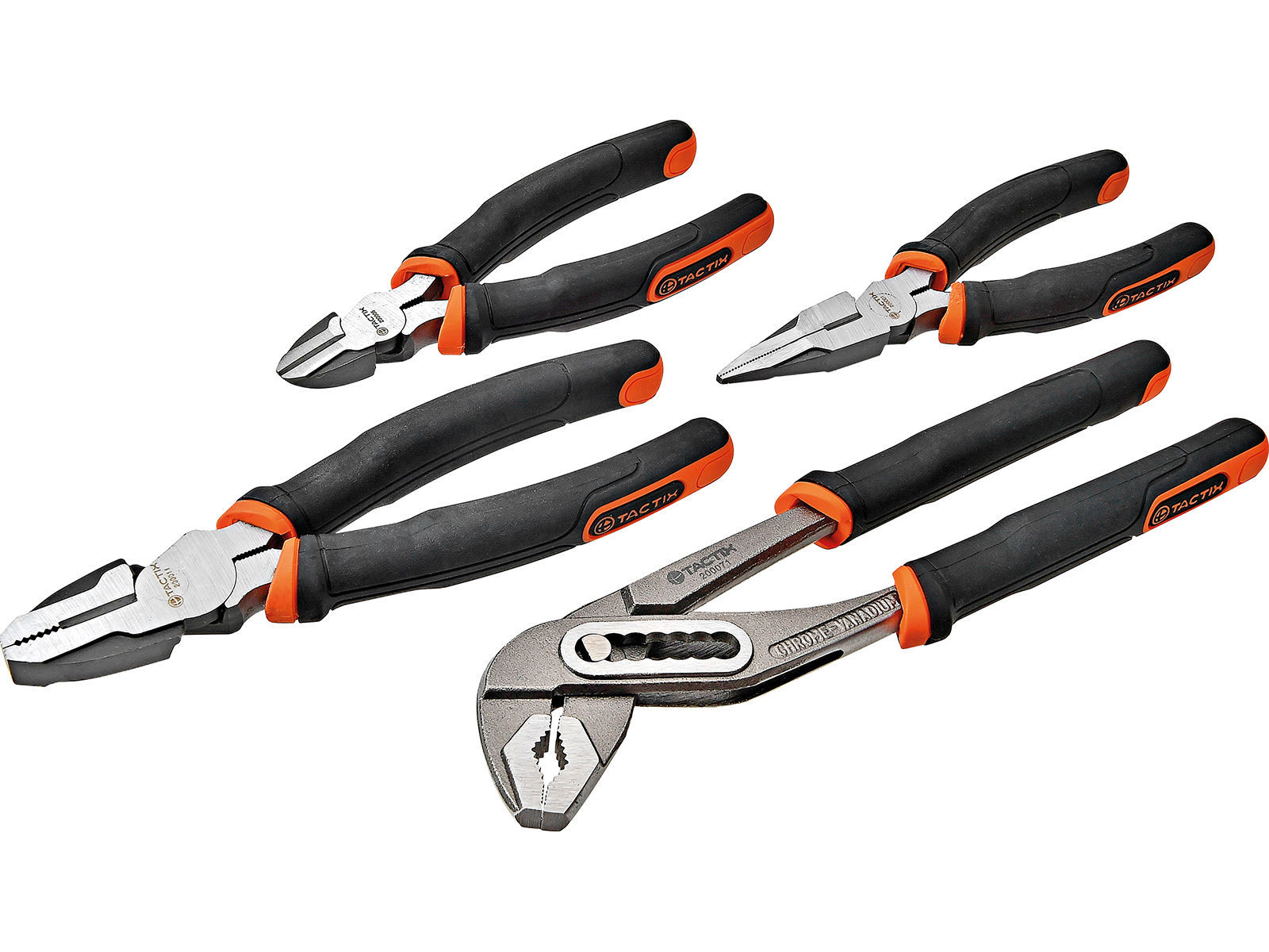 Settet består av 160 mm nebbtang, 160 mm sideavbitertang, 190 mm kombinasjonstang, 250 mm vannpumpetang. Utført i krom vanadium. Ergonomisk og gripevennlig grep.