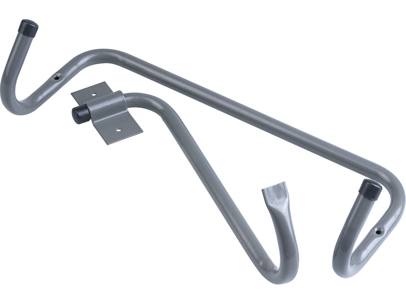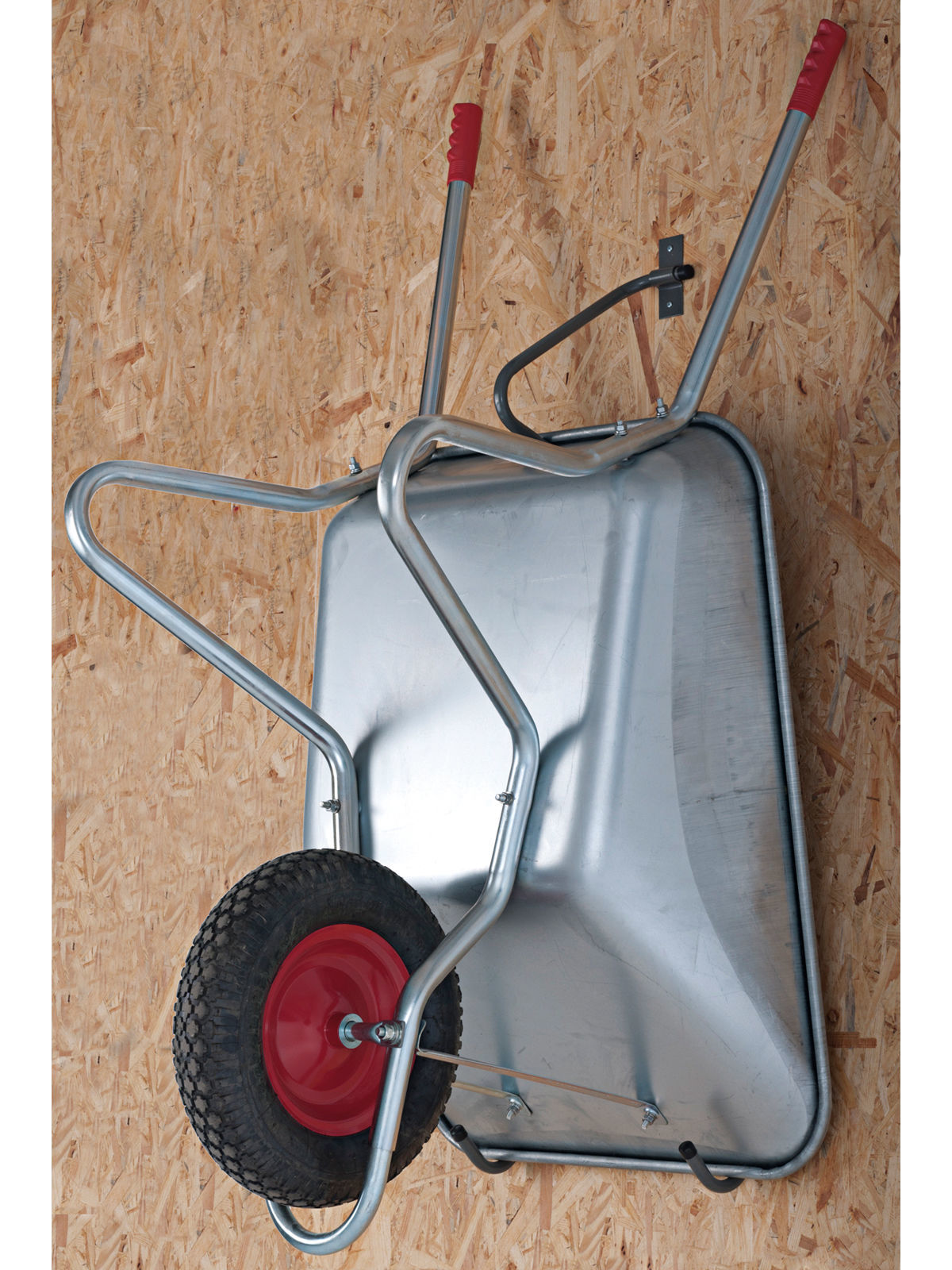 Opphengsbeslag for trillebår, utført i grålakkert stål.
