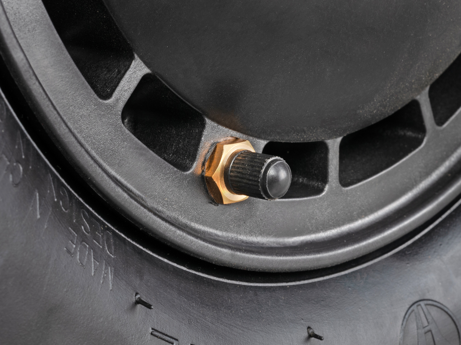 Leveres med kraftig, mønstret slangeløst dekk foran, og 2 stk støttehjul bak.