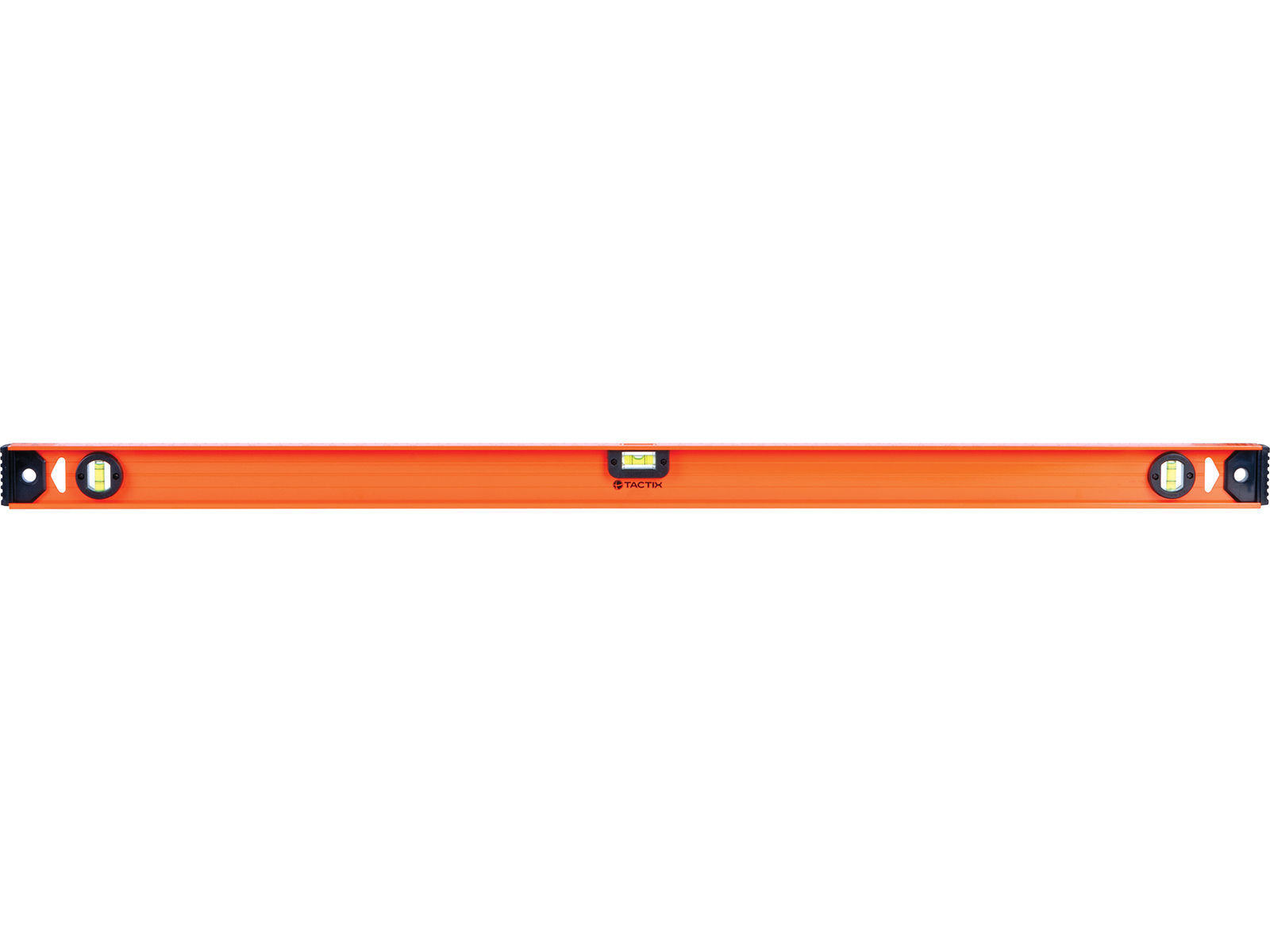 Aluminiumprofil med tre libeller, 2 vannrett og 1 loddrett. Planfreste anleggsflater og frest V-spor på undersiden (sikrer bedre presisjon på rør). Støtdempende endestykker