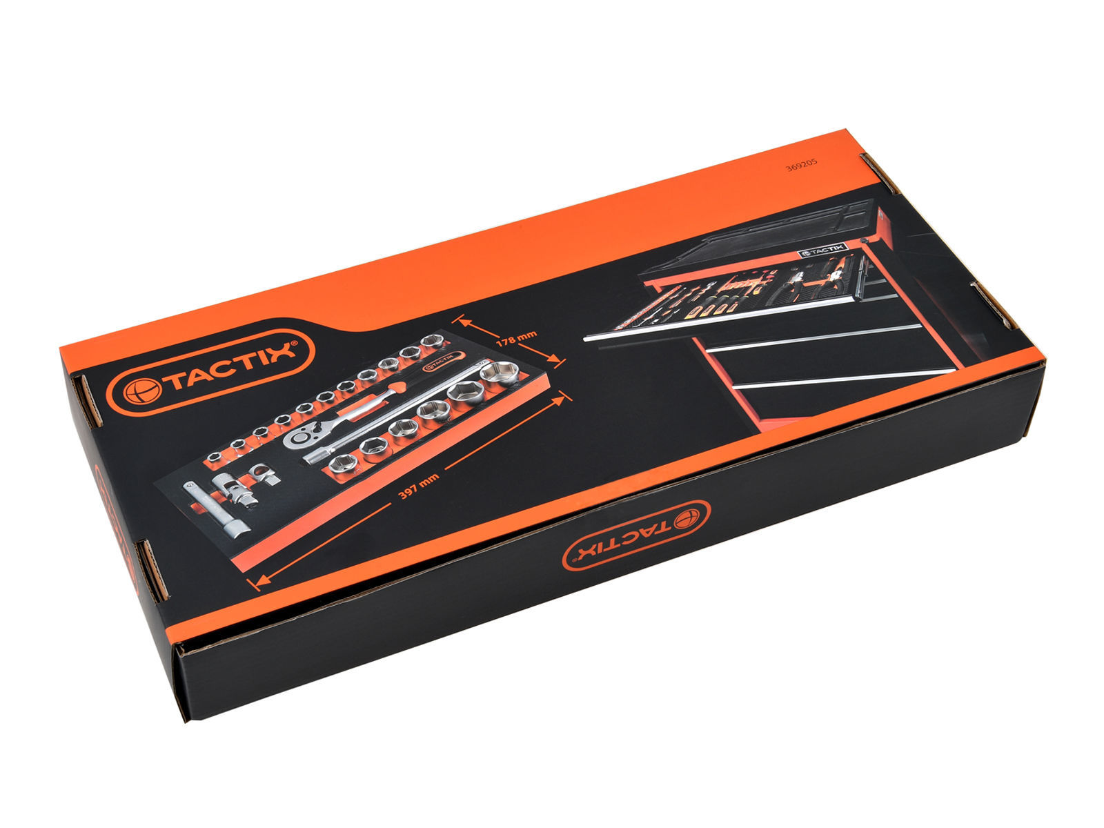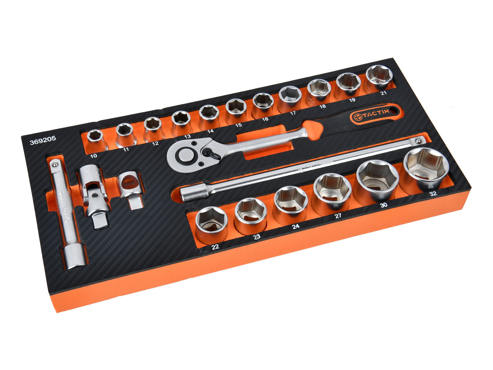 Verktøysett som gir deg enkel og ryddig organisering av dine verktøy. Med det to-fargede skuminnlegget ser du umiddelbart hvor verktøyet skal plasseres og om det er verktøy som mangler. Passer til Tactix skap. Størrelsen på settet er (BxL) 178x397 mm.